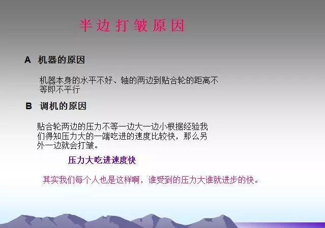 背輥及各過(guò)輥粘有異物或使用過(guò)多的水。需要經(jīng)常檢查,及時(shí)發(fā)現(xiàn)并清理,并注意不要損傷輥面。